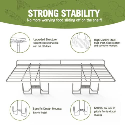 š„Strong Stability: We upgrade the structure of this griddle warming rack to keep the rack horizontal and not tilt down. Our Blackstone warming rack comes with 4 screws in the package for fixing it for your griddle securely and stably without shaking. No more worrying food sliding off at the shelf!
